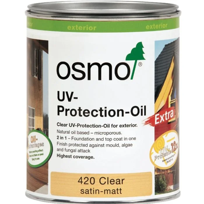 Osmo UV-Protection Oil 420 Extra is furnished with active ingredients to protect the coating against mould, algae and fungal attack. It’s a microporous, penetrating finish which does not crack, peel or flake and delays natural greying 12 x better than bare wood.